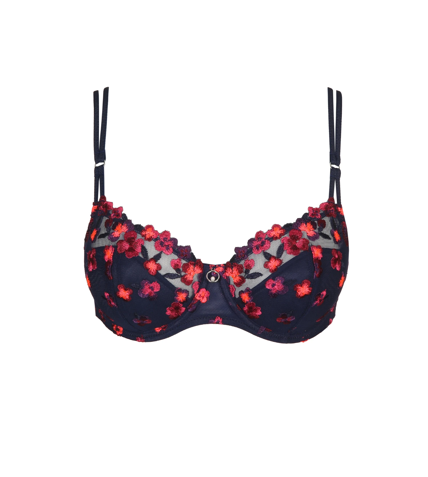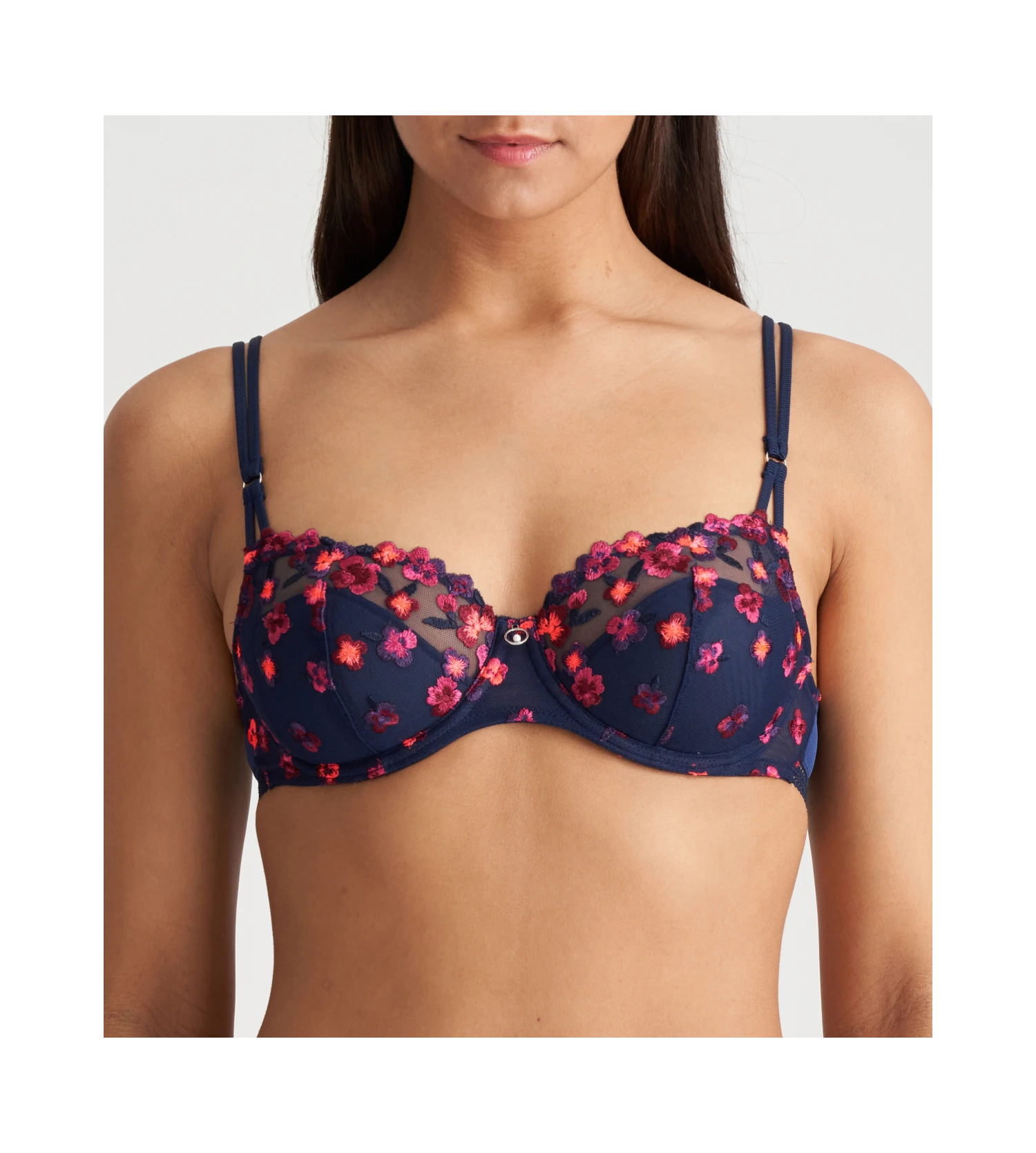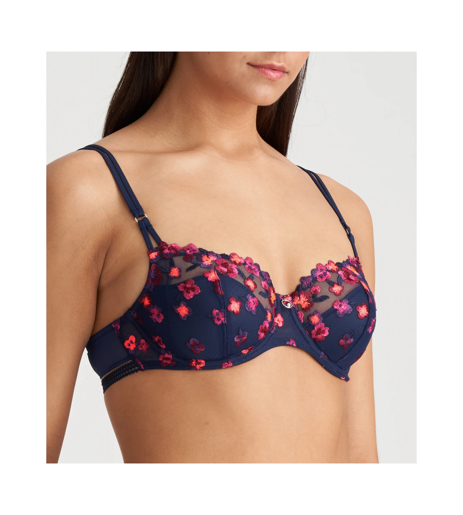 - Luxueuse broderie florale sur les bonnets qui s’Ă©tend aux cĂ´tĂ©s du soutien-gorge.