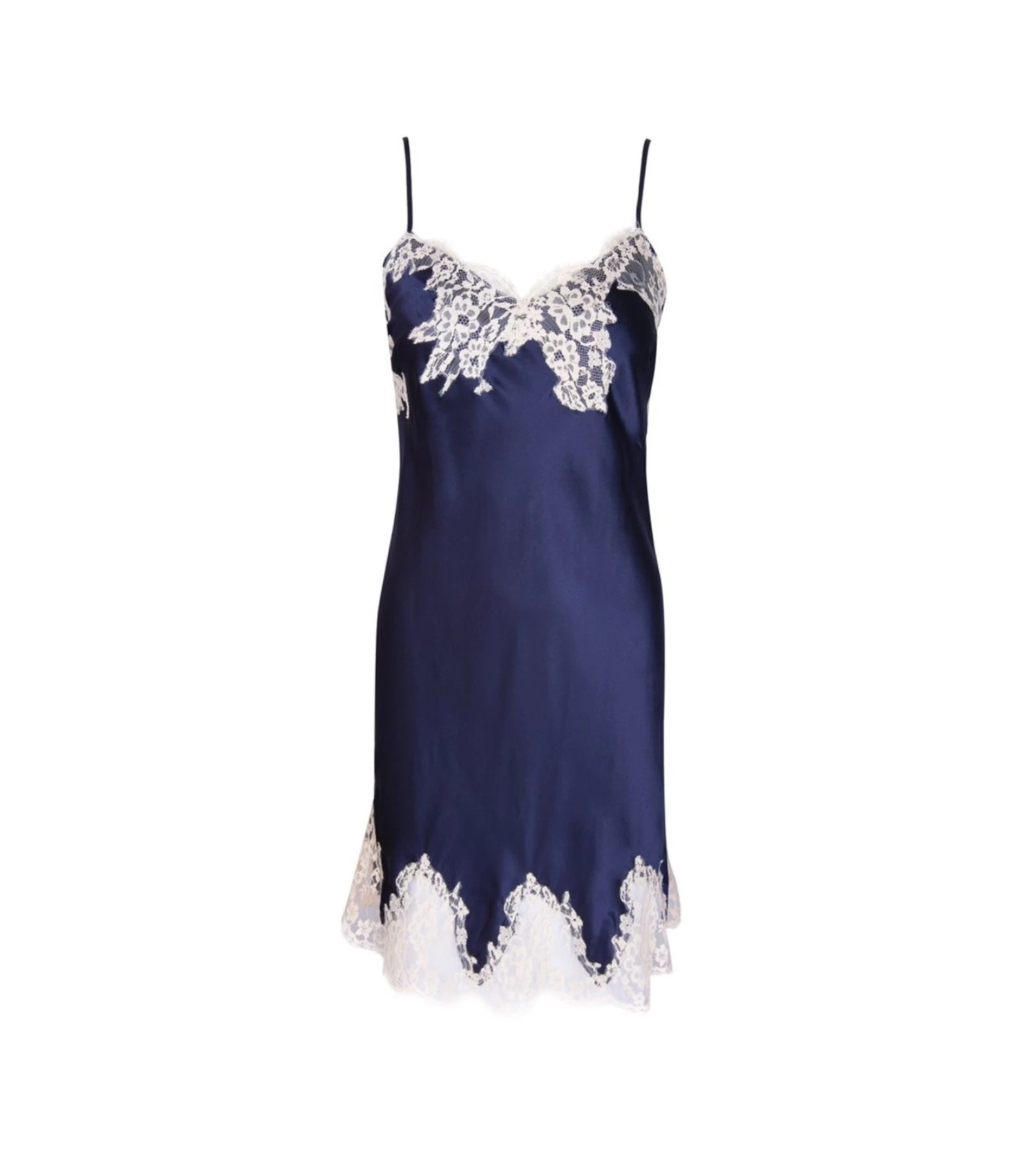 Nuisette à bretelles fines légèrement évasée sur le bas. Longueur dessus genou. Nuisette en satin de soie. Incrustation de dentelle de Calais. Bretelles soie.