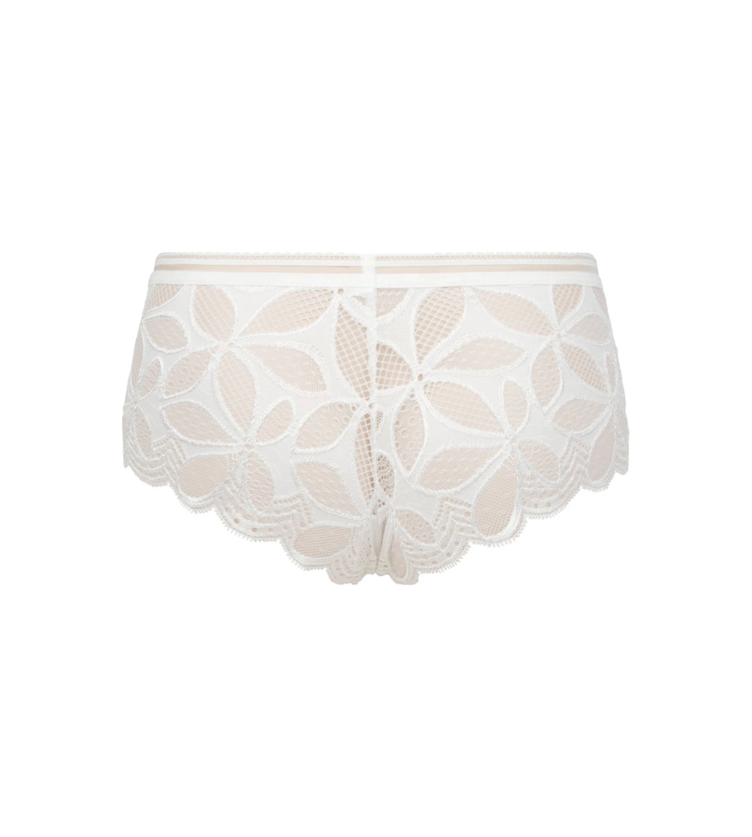 - Boxer court en microfibre douce, résille et dentelle florale plumetis.
