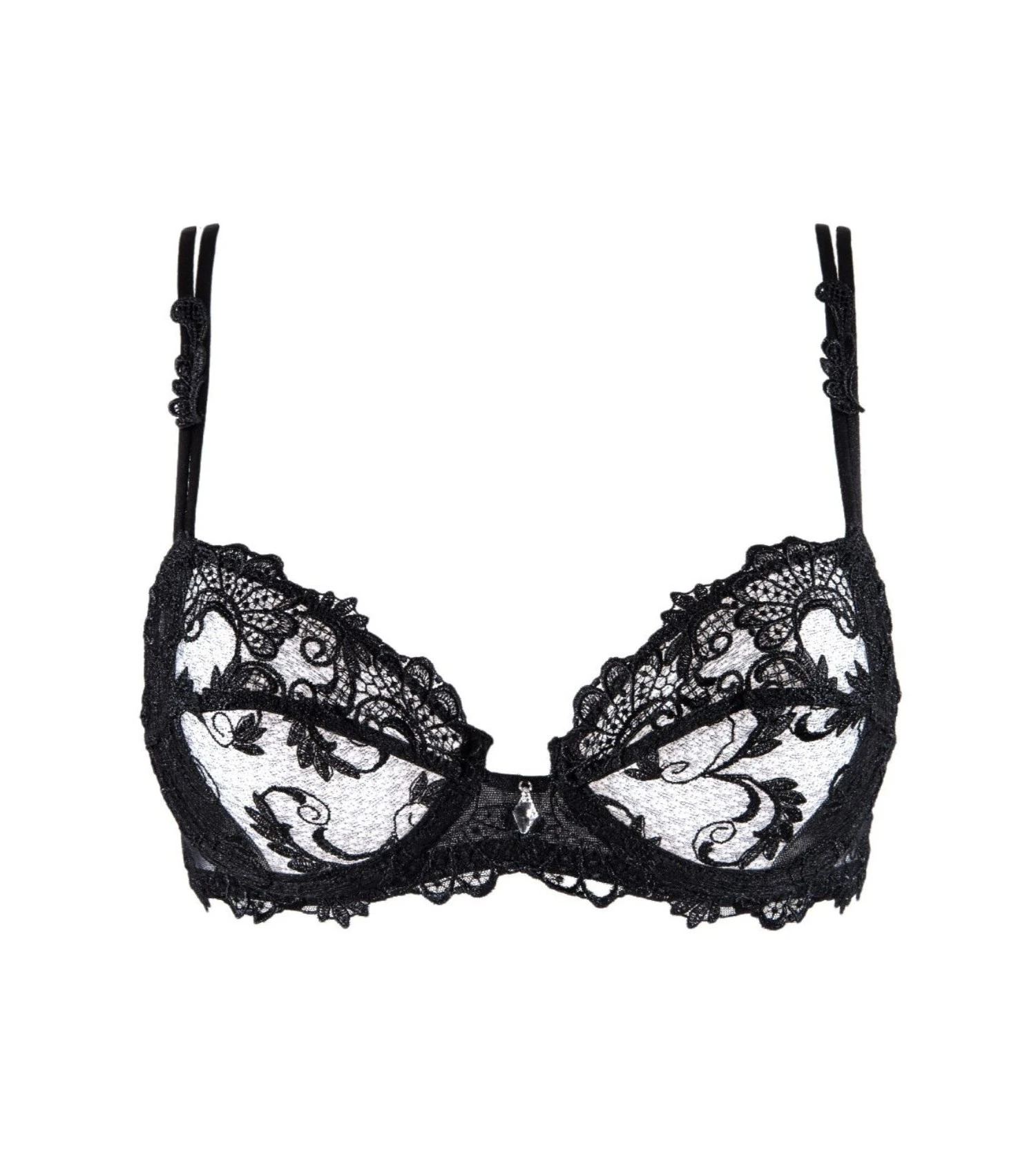 Soutien-gorge Dressing Floral haute couture Ă©gayĂ© d’un dessin spectaculaire rĂ©alisĂ© en point guipure sur de la lingerie tendance et Ă©lĂ©gante. Style chic d’inspiration Art DĂ©co tout en douceur et transparence, relevĂ© d’un bijou scintillant.