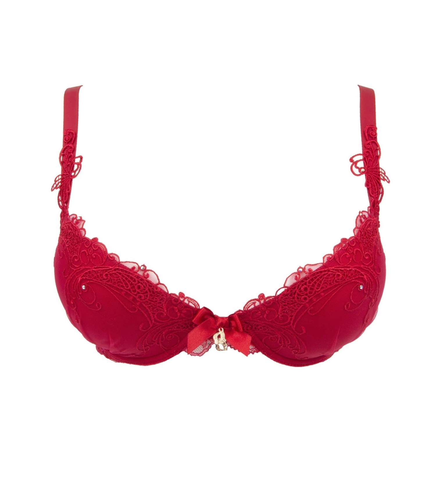 Poitrine galbée et arrondie. Coques souples. Bonnets brodés avec incrustation de guipure et strass. Dos en dentelle de Calais festonnée. Bretelles satinées, motifs guipure. Nœud satin, masque avec strass Swarovski.